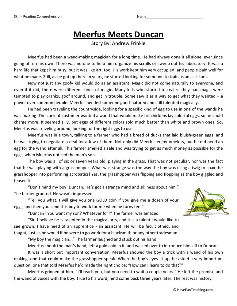 This Reading Comprehension Worksheet – Meerfus Meets Ducan is for teaching reading comprehension. Use this reading comprehension worksheet to teach reading comprehension. This reading comprehension story comes with 5 Questions & Answer Key.