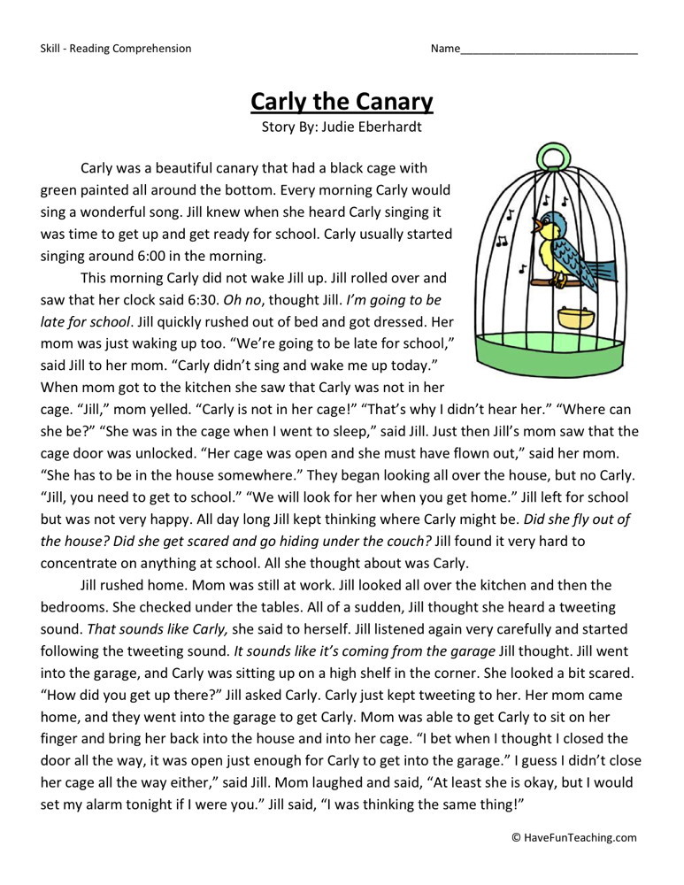 This Reading Comprehension Worksheet – Carly the Canary is for teaching reading comprehension. Use this reading comprehension worksheet to teach reading comprehension. This reading comprehension story comes with 5 Questions & Answer Key.