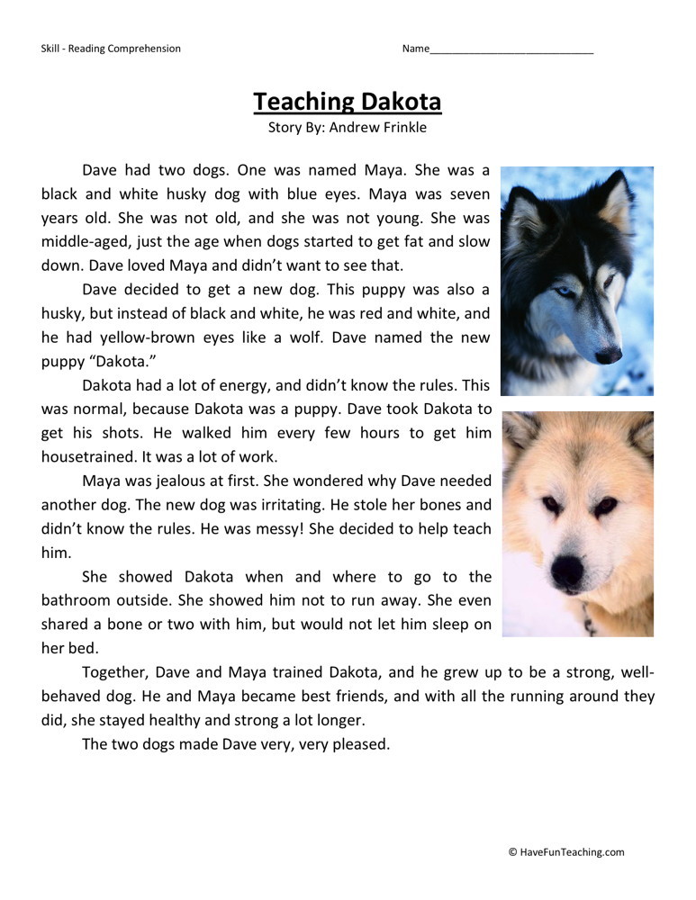 This Reading Comprehension Worksheet – Teaching Dakota is for teaching reading comprehension. Use this reading comprehension worksheet to teach reading comprehension. This reading comprehension story comes with 5 Questions & Answer Key.